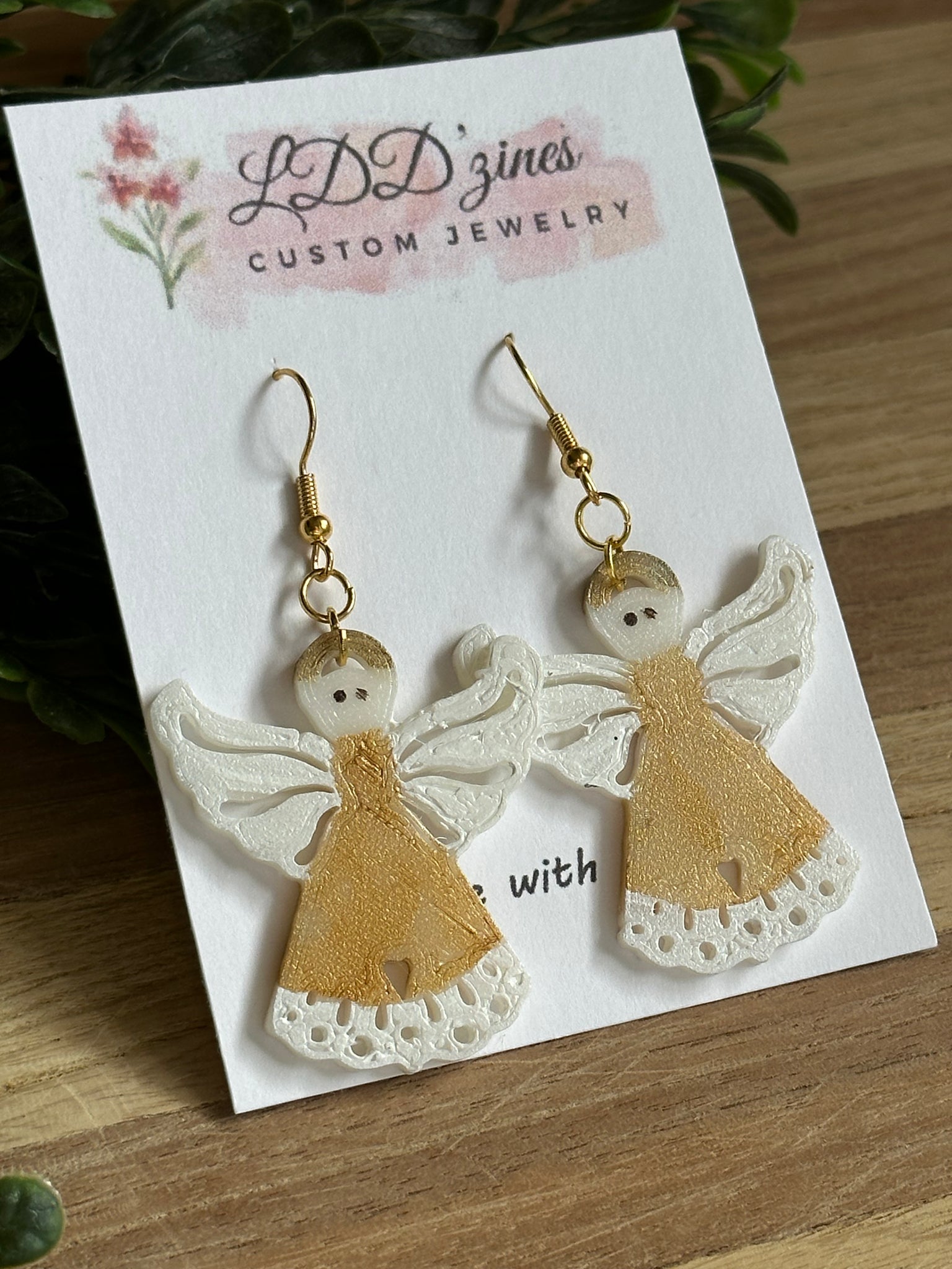 These are hand painted. Grab these pretty and lightweight earrings. The angels are beautiful and can be worn all year round!!
