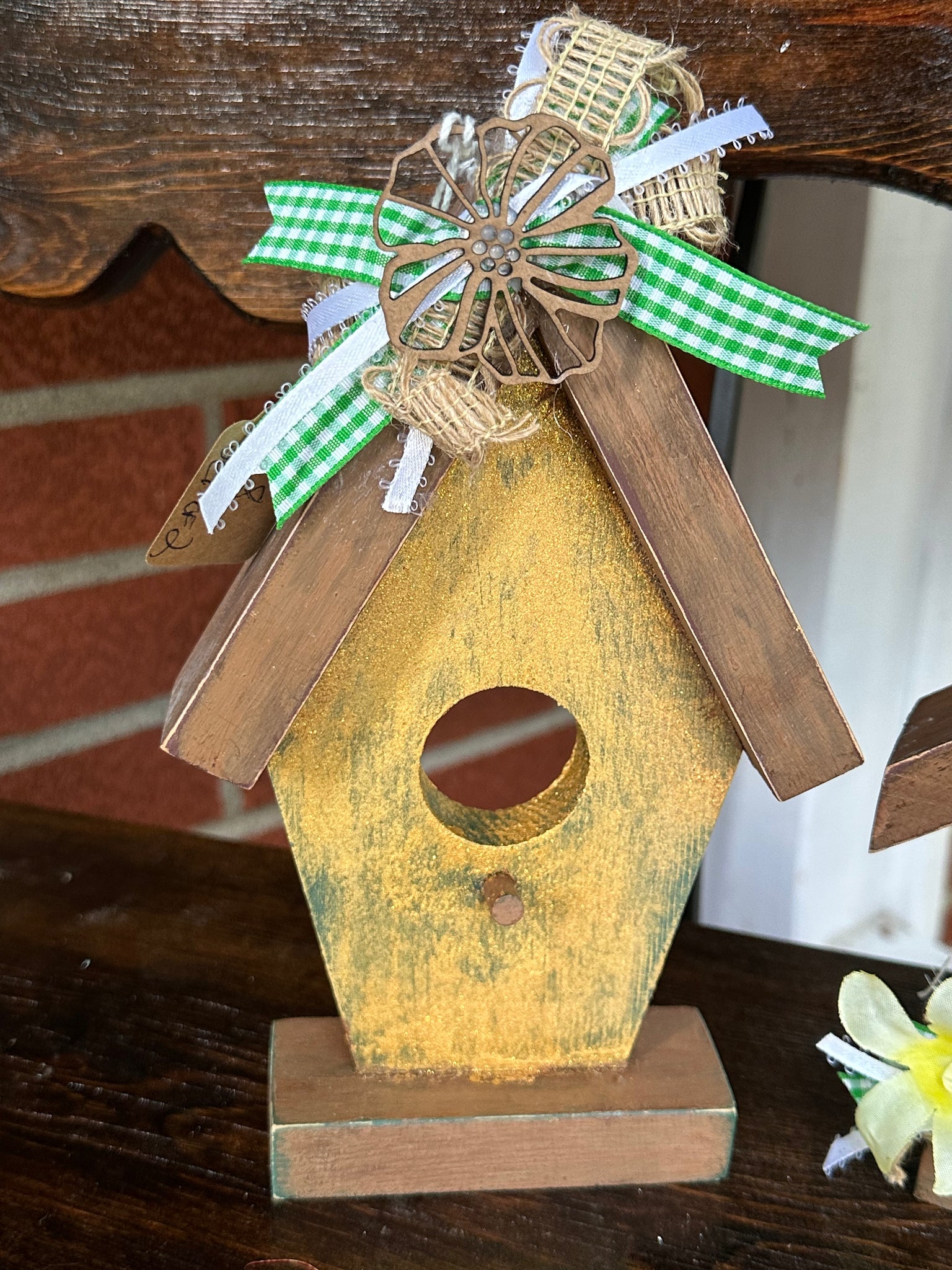 These were some old home interior birdhouses. I did a refresh with them. Made some cute goldish houses with little floral accent.