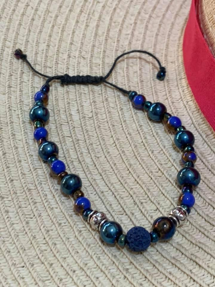 A Blue Lava Bead is on top for your essential oil with lots of glass beads with blues and variated colors. This is an adjustable bracelet. This is hand made.