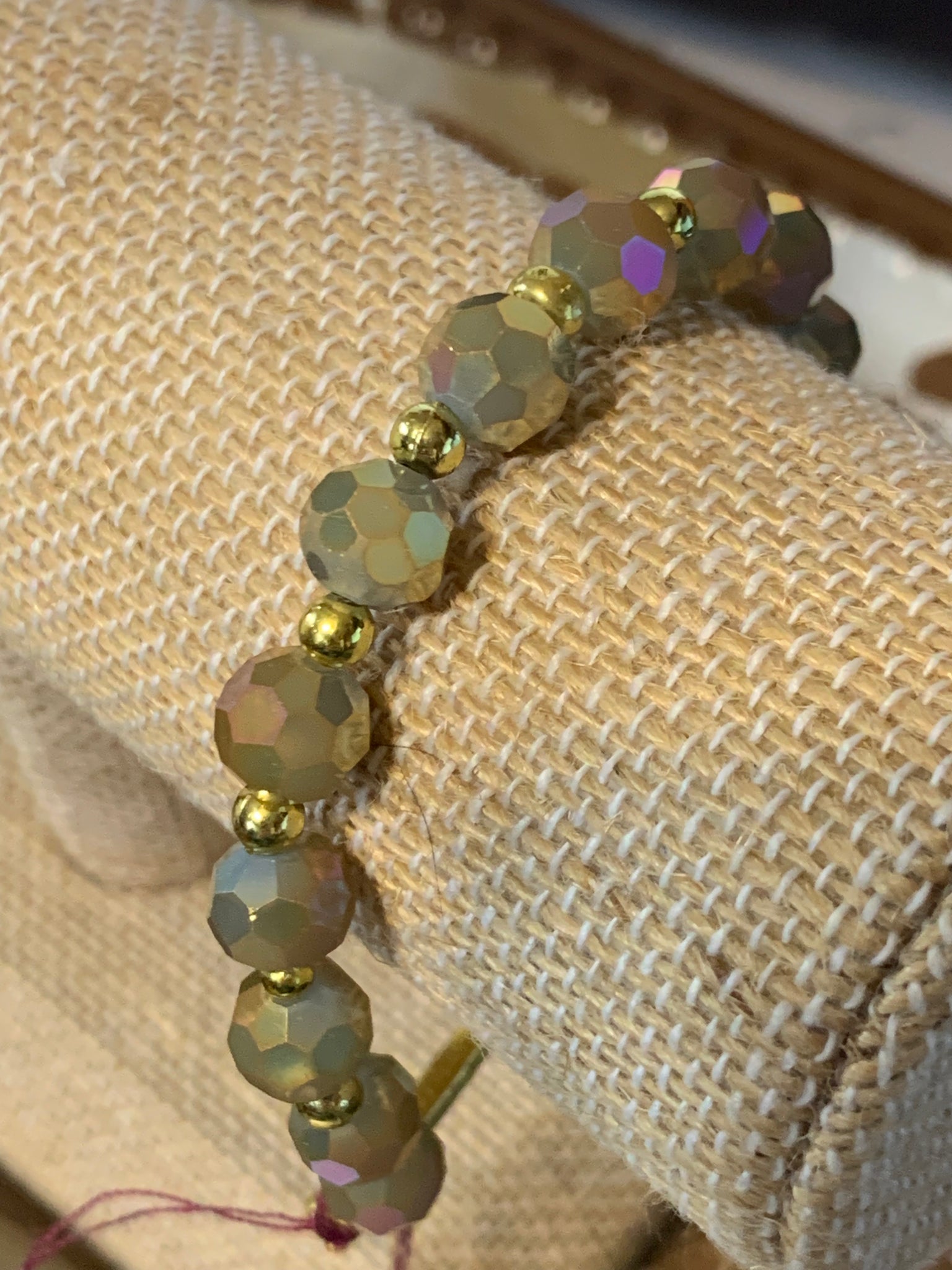 Neutral beads really add to this cross bling connector. This is a stretch bracelet.