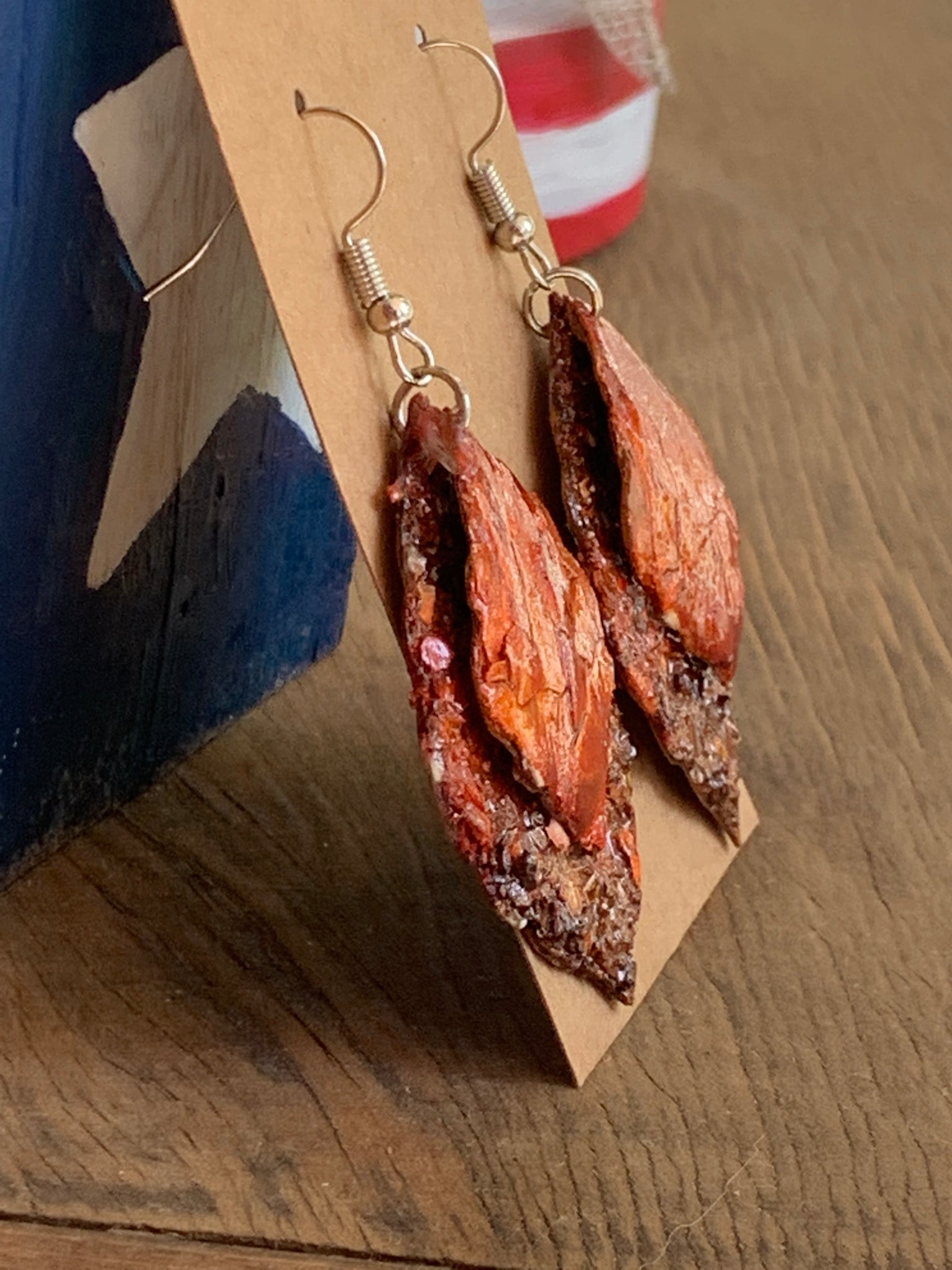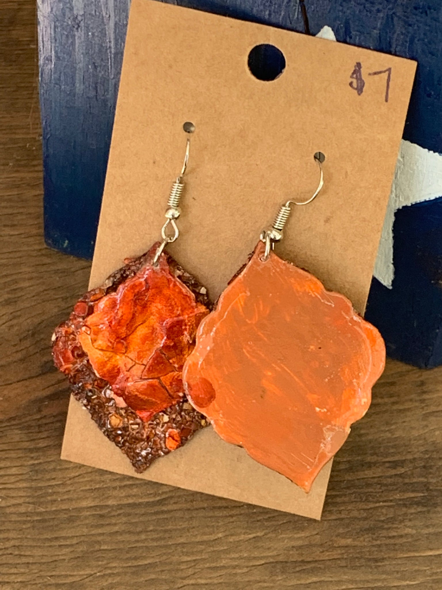 These colors are so rich! They make you feel a cool fall evening. The shape is unique sets them off with oranges and reds. These are a base of cardboard food box with eggshells!! Approximately 1.25” by 1.5” earring only.