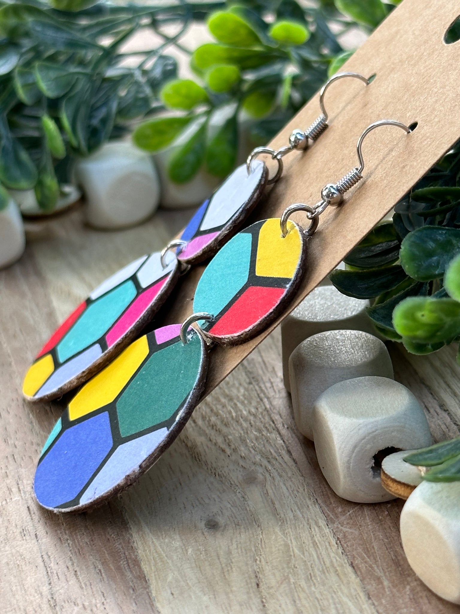 These dangles are cute with the smaller round and the bigger around with the eclectic colors all over. These are wood and light weight on the ear. Drop is 3".
