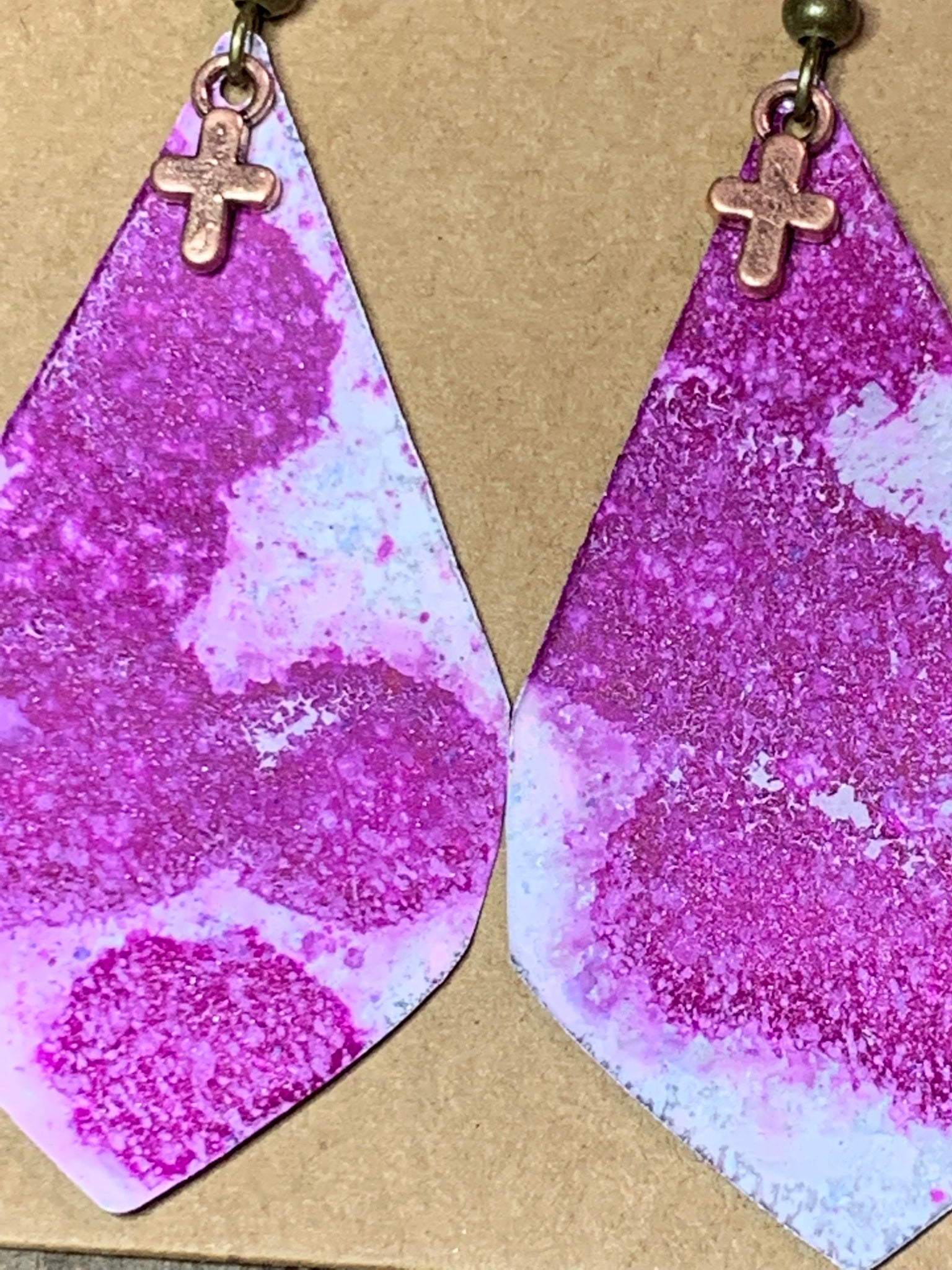 This is sort of a tie dye affect with the alcohol ink so cute with the white and hot pink. The gold charm of a cross just adds a pot to the top. These are aluminum and very light weight.