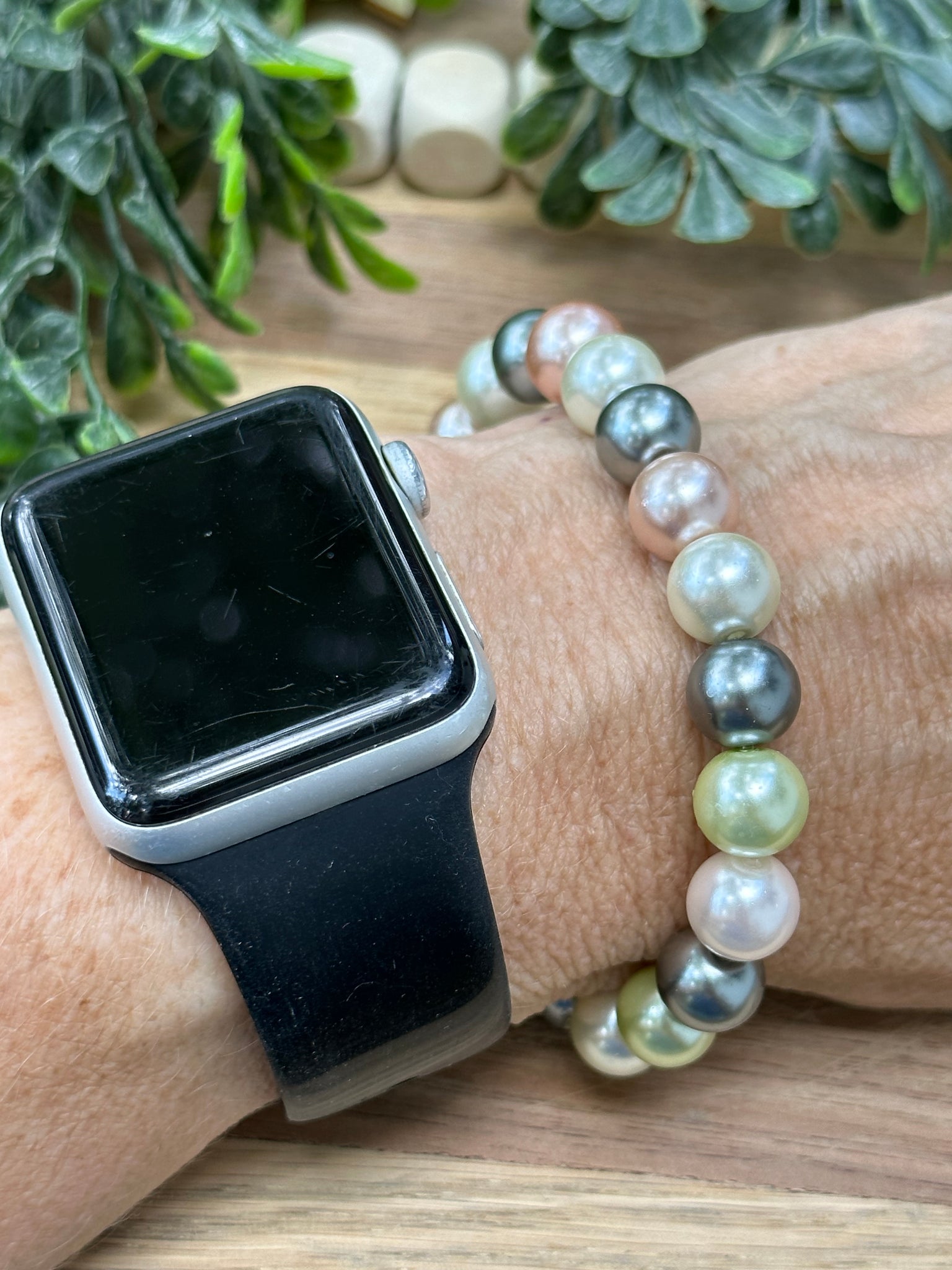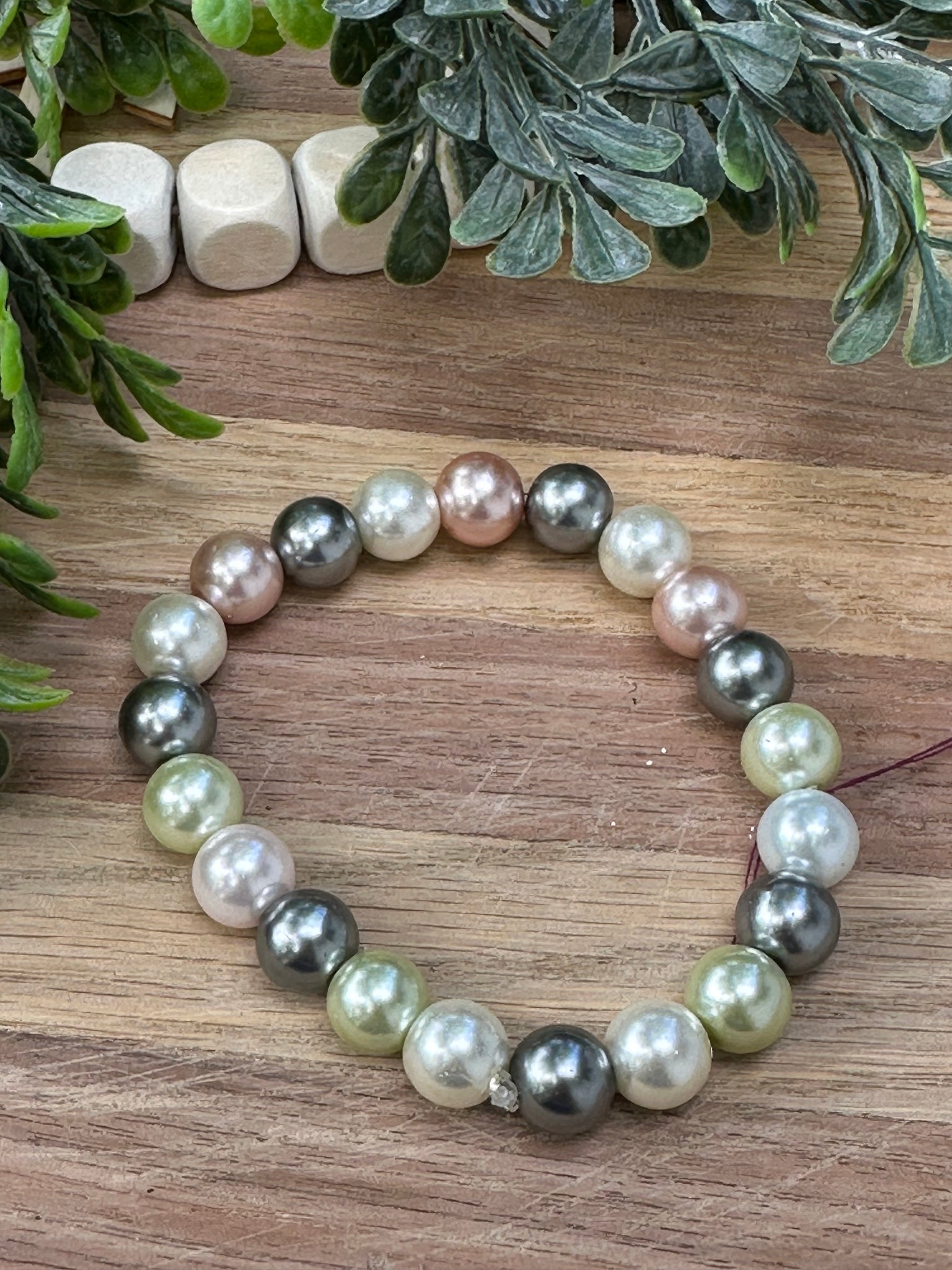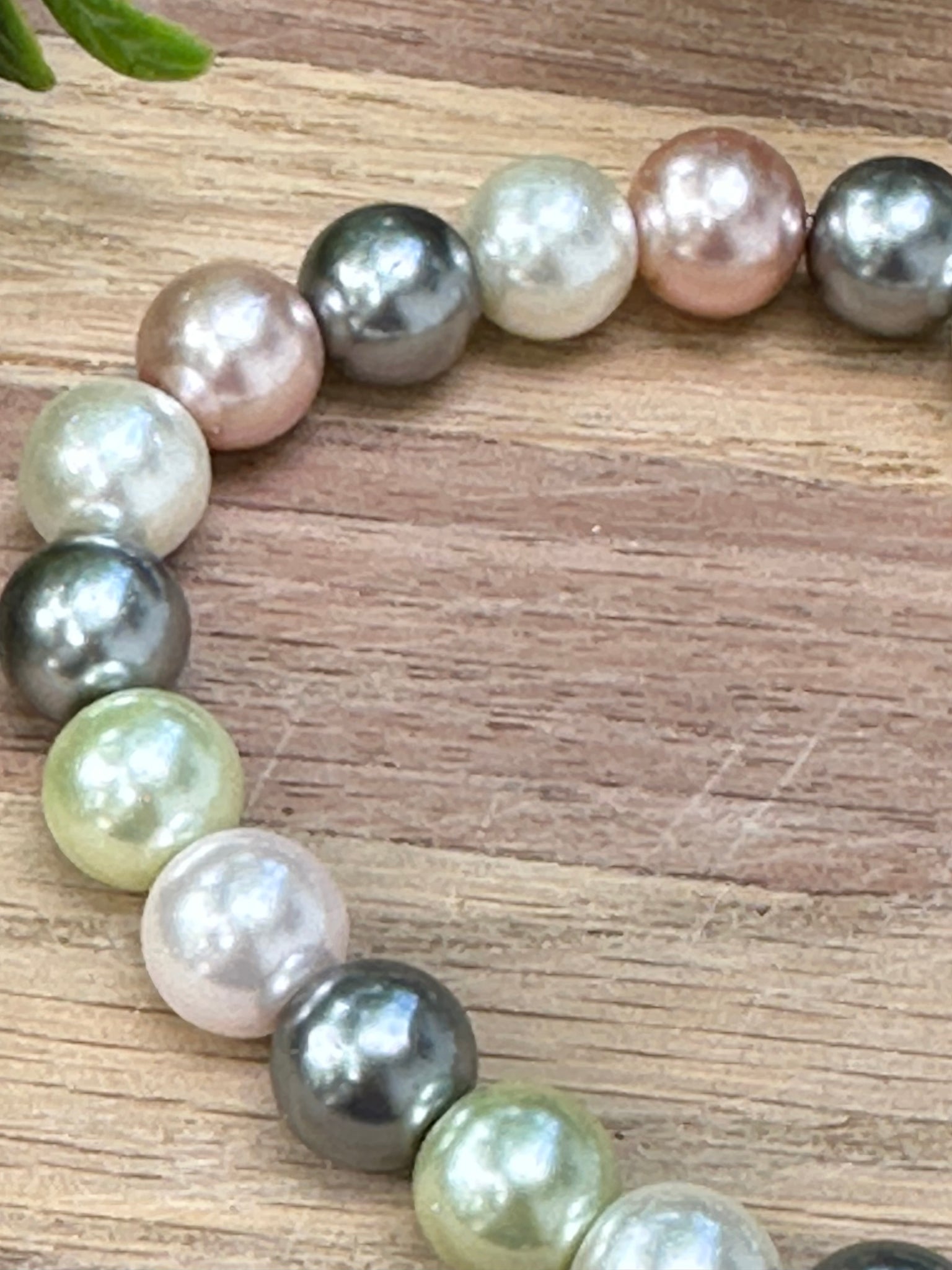 This blend of peach/pink, cream/yellow, and gray/green bead is stunning. It will go with anything. This is a stretch bracelet. Fits approximately a 7.5" or smaller wrist.