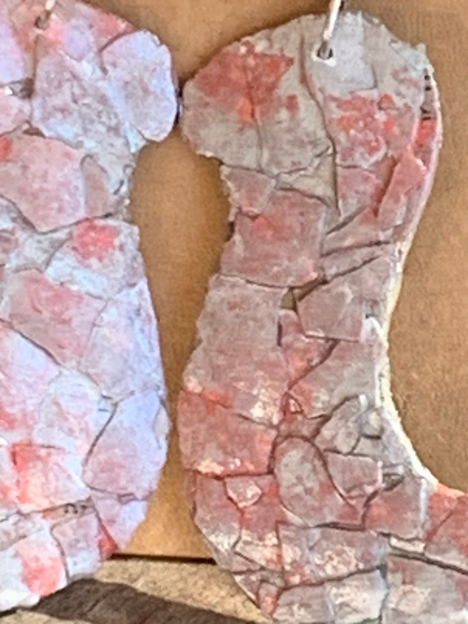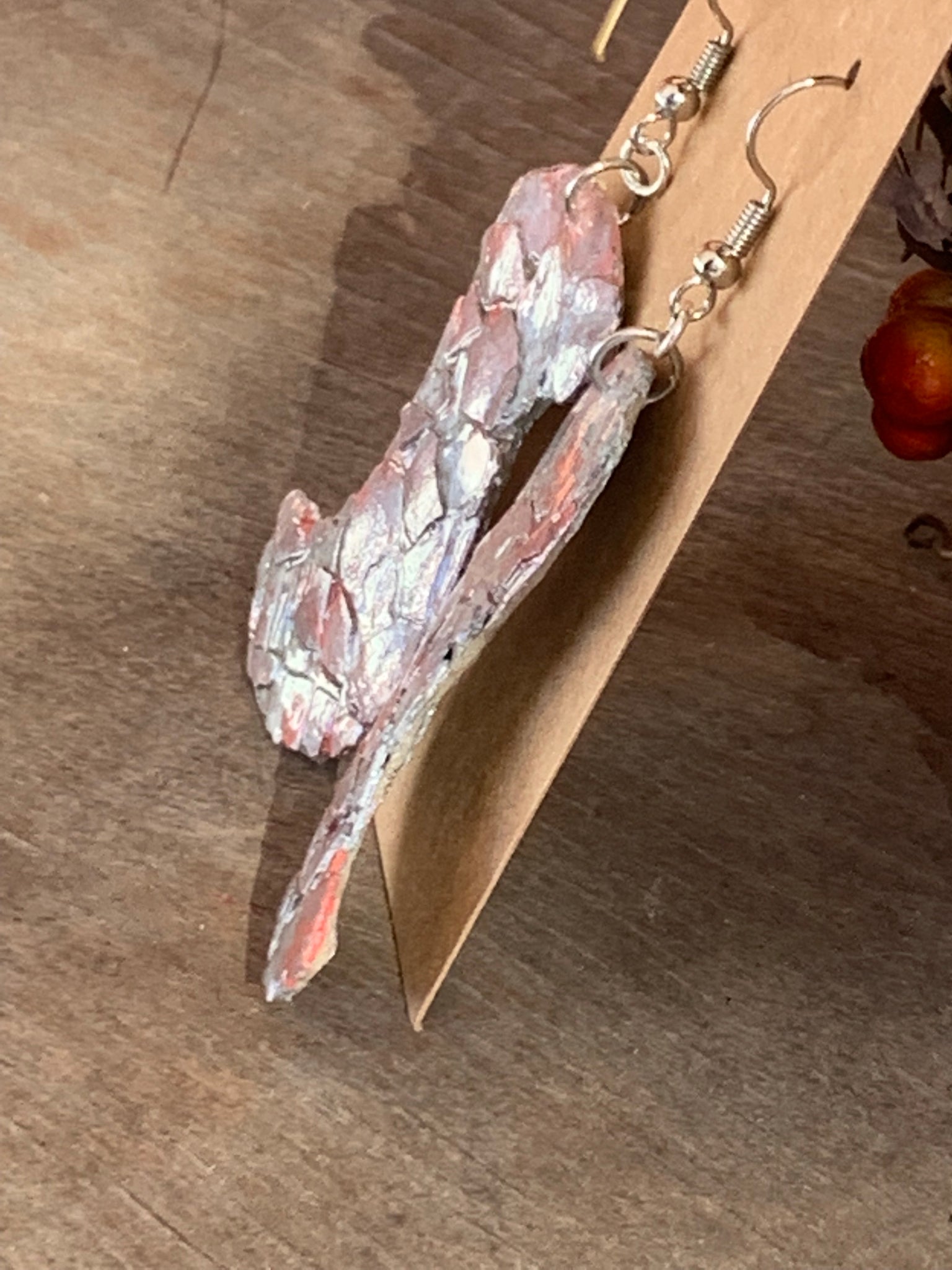CLEARANCE ITEM!! These original shapes hang beautiful on your ears. The silver with a hint of red are perfect for the holidays. Great for valentines and a simple summer earring. These are made of recycled products such as eggshells and cardboard.