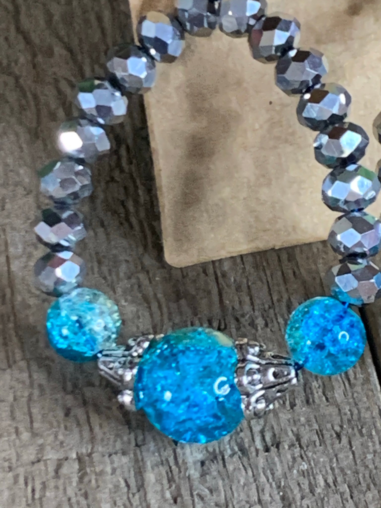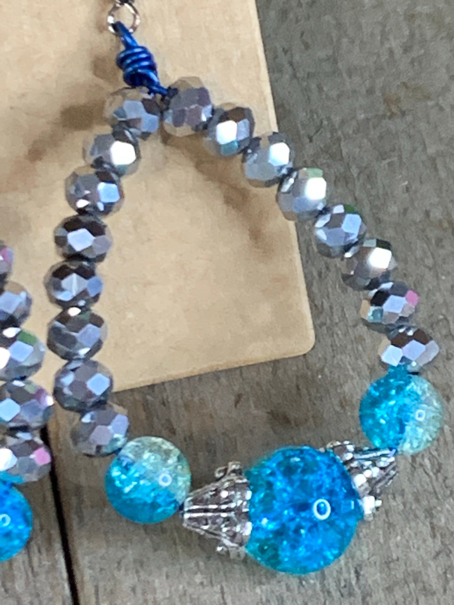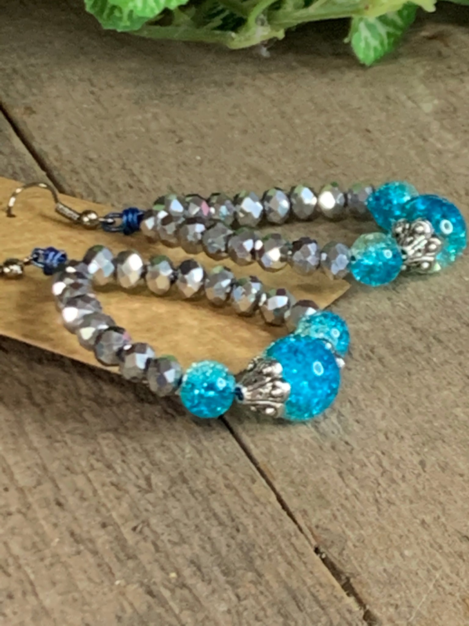 Flashy silver geometric shaped beads will really sparkle and shine. The blue and clear crackled beads are gorgeous. The drop length is 2.75".