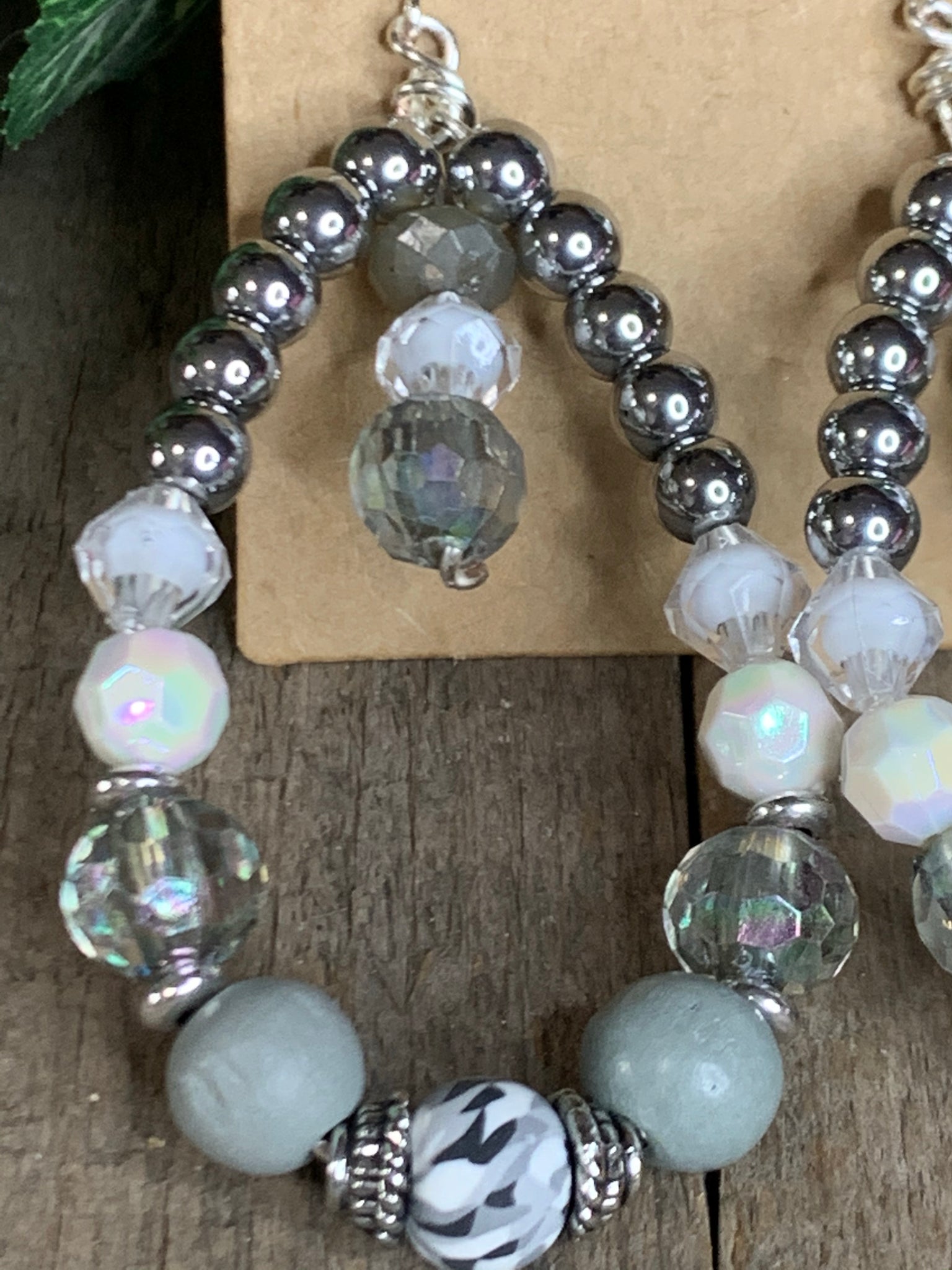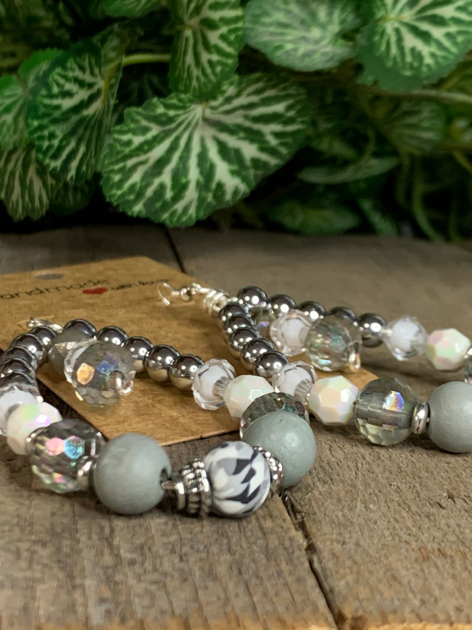 This is a heavier earring so if you have sensitive earring, these aren't for you! This is a great basic neutral earring with silver, gray, white, clear and tie-dye black and white clay bead. A center drop at the top adds a unique touch. The drop length is 3.25".