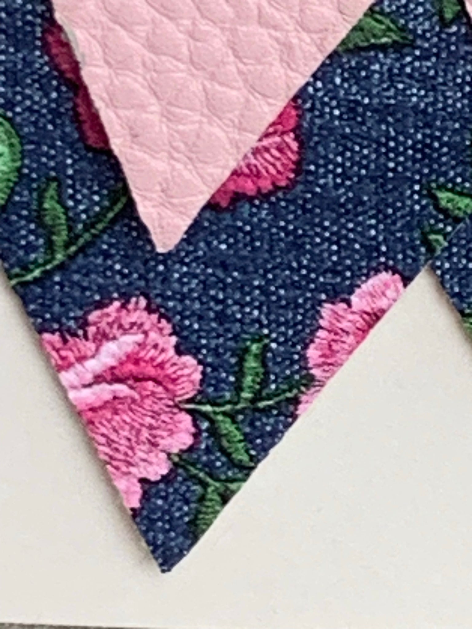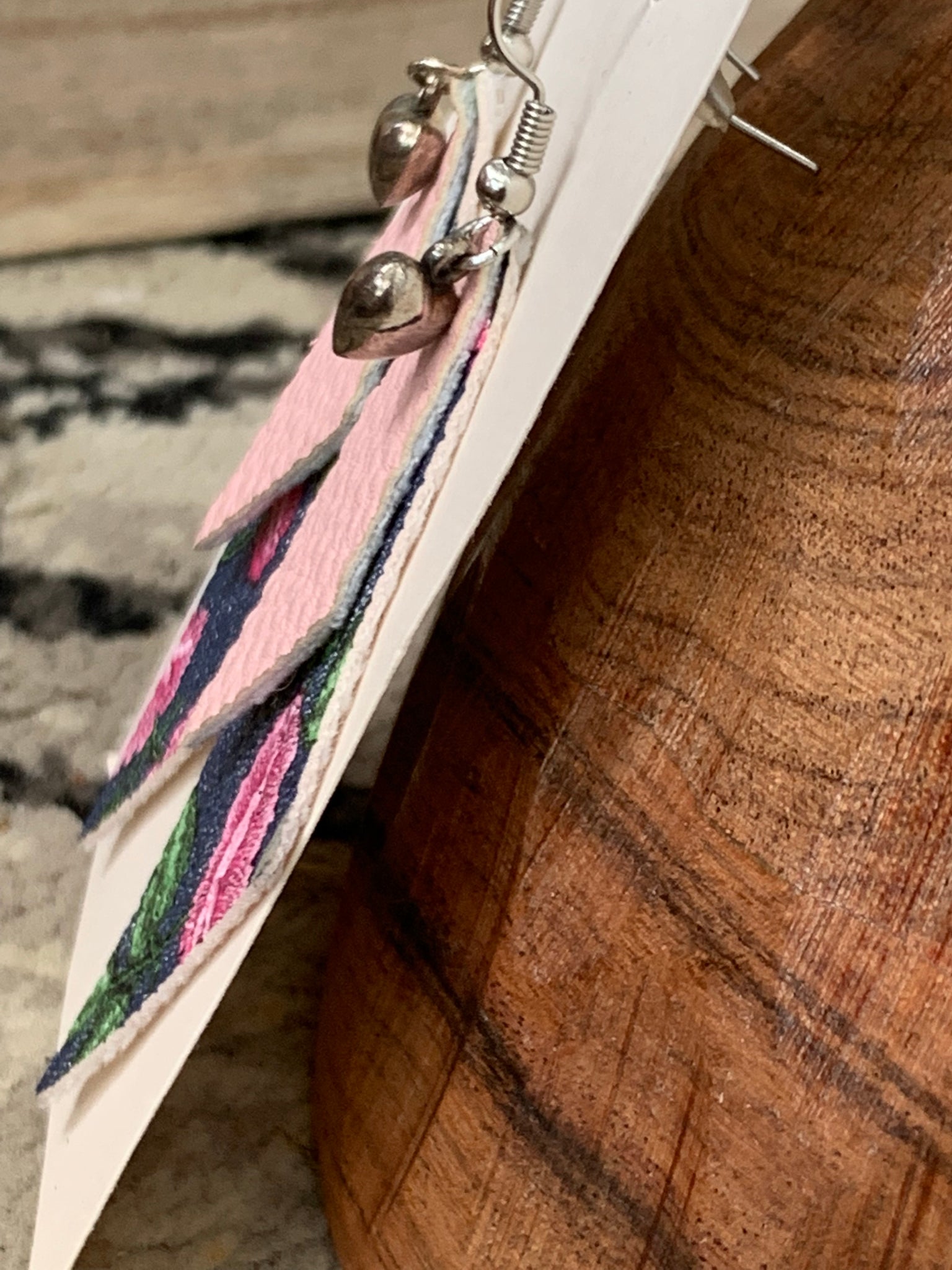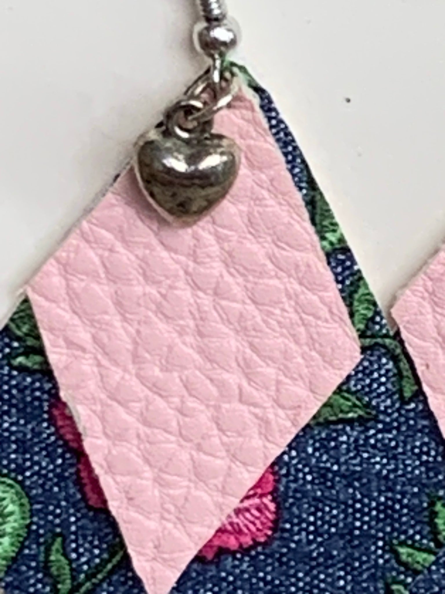 This pair of summer floral faux leather earrings with a charm just make you feel happy. The light pink makes them stand out with a heart charm. The earrings are about 2.4" with total drop length of about 3."
