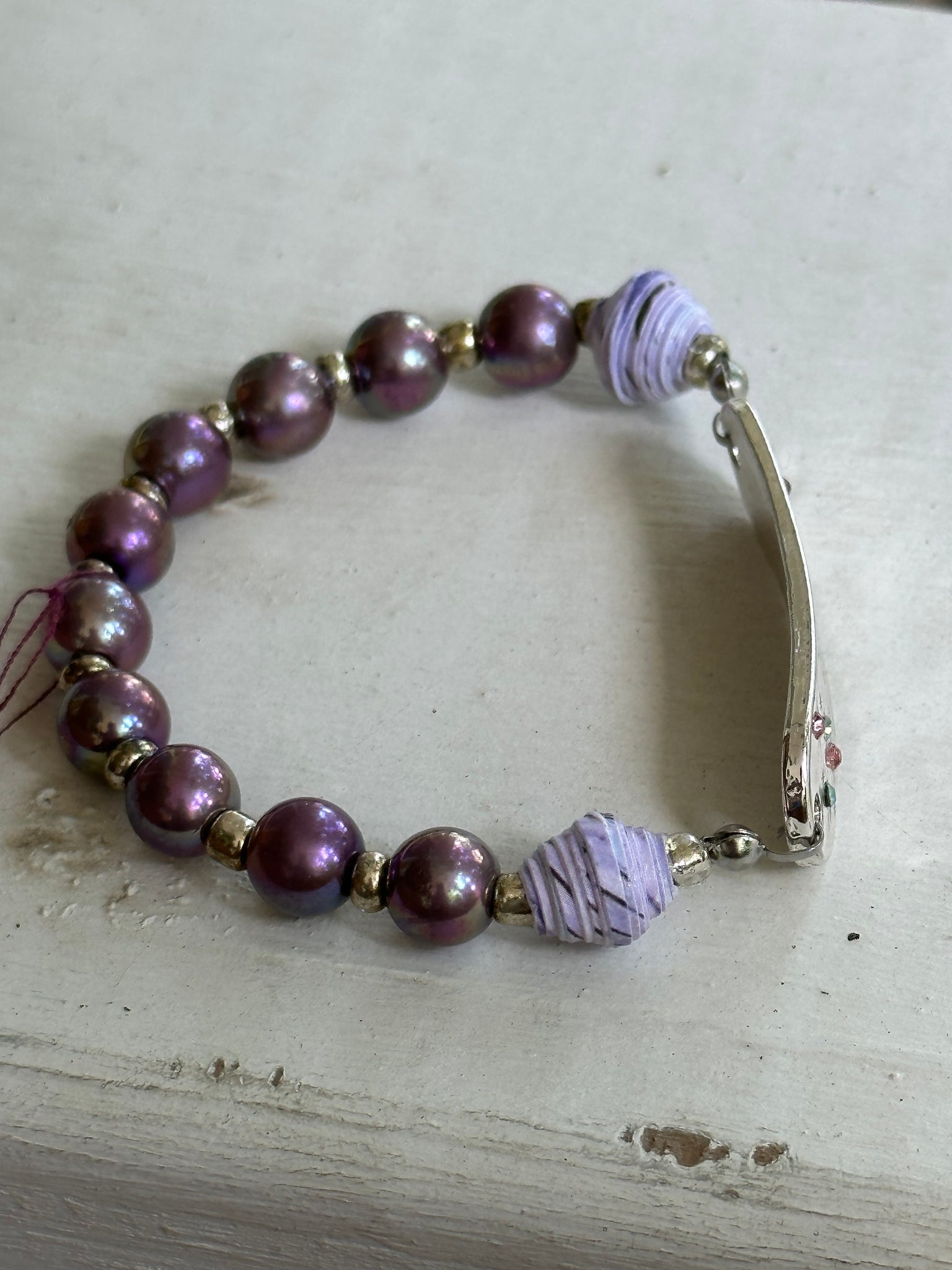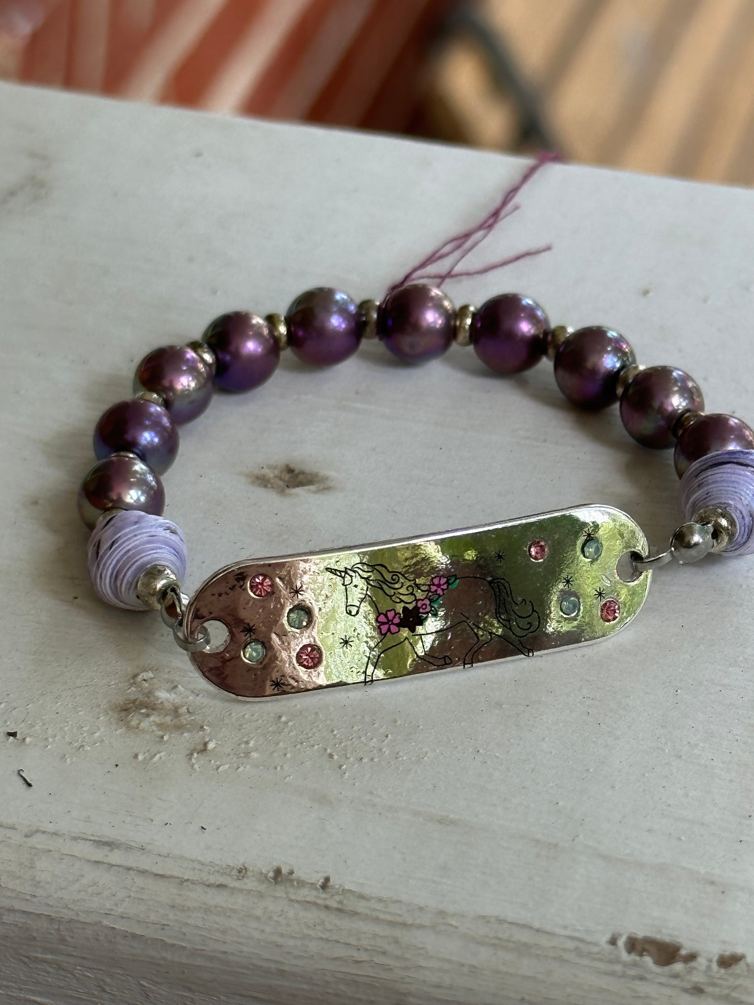 For the unicorn lover. The beads on the each side of the connector are handmade. So fun to make but time consuming! This is a stretch bracelet. This is for a smaller wrist. It will fit a 7” but if you like it looser you might not be happy but if you are 6.5” or smaller you’ll love it.